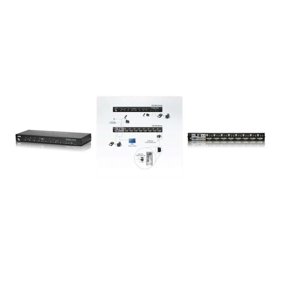 ATEN KVM Switch 8PC USB DVI +Audio CS1768, Bemeneti készlet: 8, Támogatott maximális felbontás (pixel): 2048x1536, Rackbe szerelés: Igen, Konzol csatlakozók: USB, DVI, Szabályzott maximális bemenet szám: 8, LED funkciók: Nem, Tápellátás: 5V, Súly (Kg): 4.65, Egyéb: DVI, USB, Audio