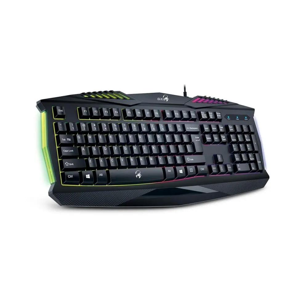 Genius Scorpion K215 Gamer billentyűzet USB Fekete, LED háttérvilágítás (kikapcsolható), 10 db multimédiás billentyű, 12 db funkció billentyű, Windows start gomb, cseppálló kivitel, 2 millió leütés él