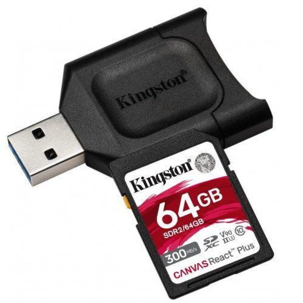 64GB SD memória kártya + olvasó, Kingston Canvas React Plus MLPR2/64GB , Csatoló felület: SDXC, Kapacitás: 64 GB, Sebességosztály: Class 10;UHS-II U3, Olvasási sebesség max.: 300 MB/s, Írási sebesség max.: 260 MB/s