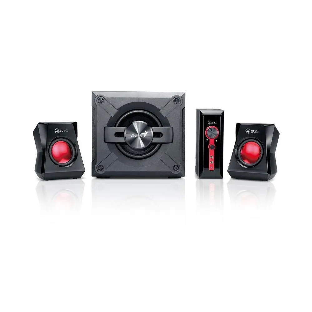 Genius SW-G2.1 1250 II 2.0 jack 36W fekete gamer hangszóró, Alap szín: Fekete, Egyéb szín: Piros, Jack 3,5mm be: 1 db, Koax (digitális RCA) be: 1 db, Fejhallgató csatlakozó: Igen, Egyéb: Gamer, Típus: 2.1 fa, Hordozható: Nem, Teljesítmény: 38,0 W